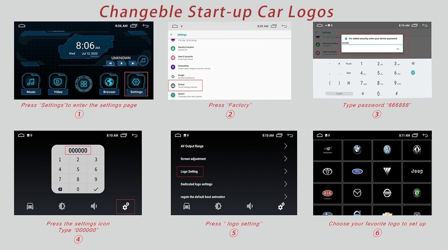 - 【 Logo Setting】 The boot logo is diversify, not only can you set the car logo, you can also set pictures, family and pets.* Logo Set-up Steps* ①Press "Settings" to enter the settings page.②Press "Factory". ③Type password "666888". ④Press the settings icon and Type“000000”. ⑥Choose your favourite logo to set up.